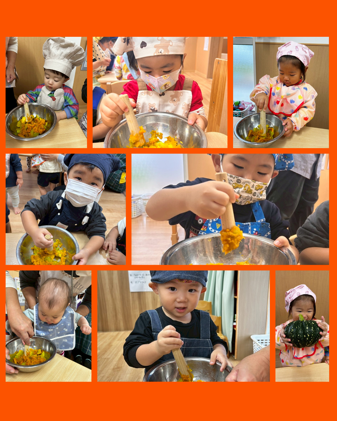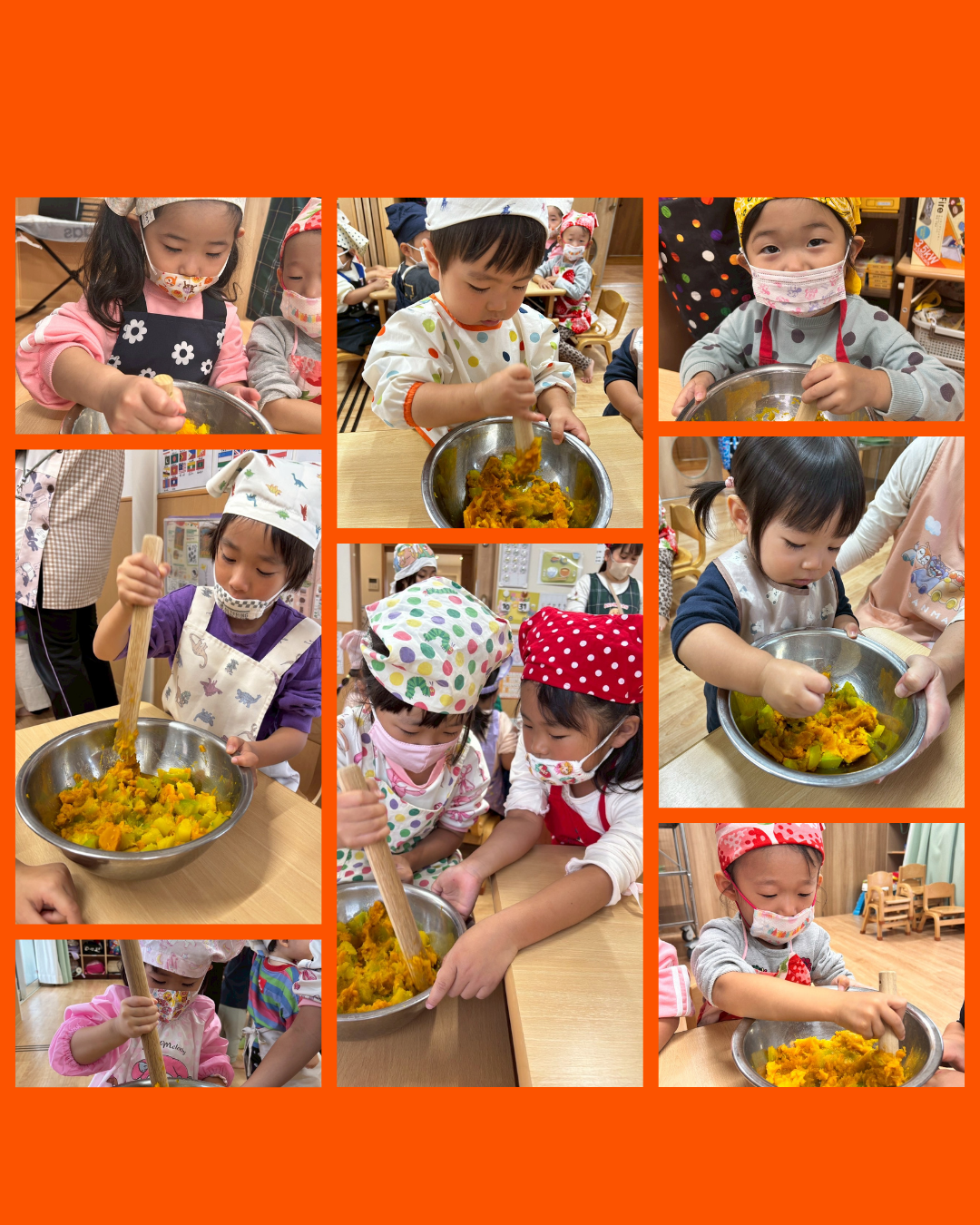 給食の先生にかぼちゃを茹でるまではしていただき子どもたちはかぼちゃをつぶすことからチャレンジ